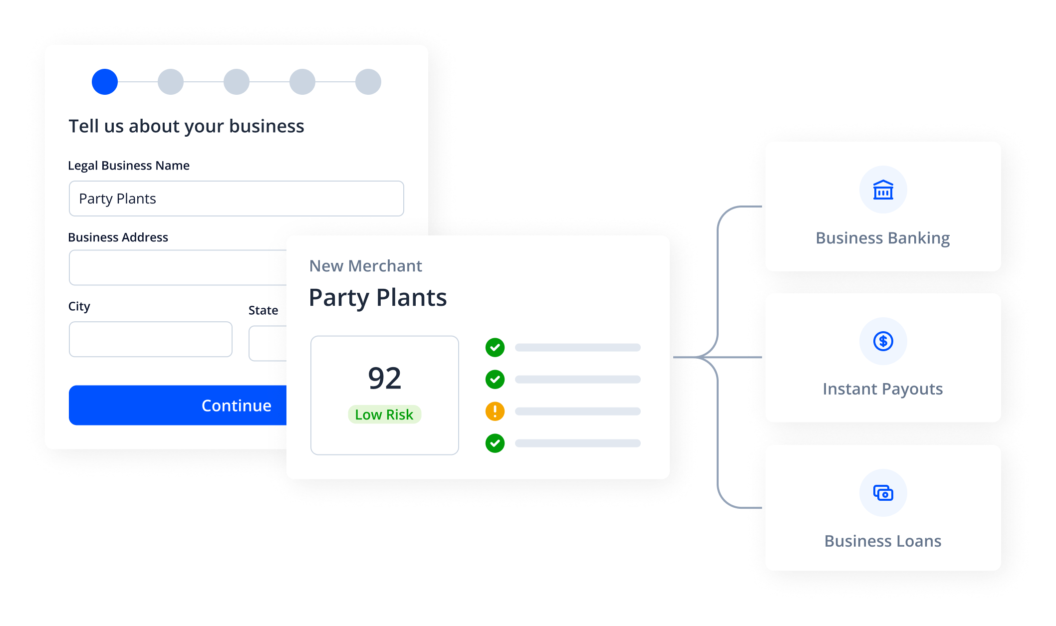 One application for all products, seamless KYB/KYC, automated underwriting, and instant creation of Jaris bank accounts for merchants.
